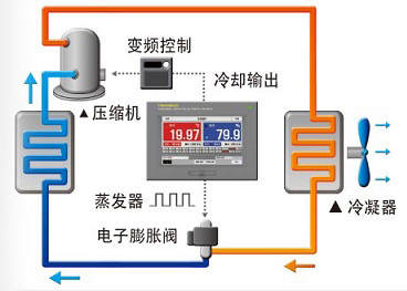 以加熱·冷卻輸出控制變頻器與調(diào)節(jié)電子膨脹閥,控制各區(qū)間的冷媒量 來(lái)調(diào)節(jié)被浪費(fèi)的加熱量及控制冷凍機(jī)來(lái)實(shí)現(xiàn)節(jié)能。(變頻控制為選項(xiàng)) |