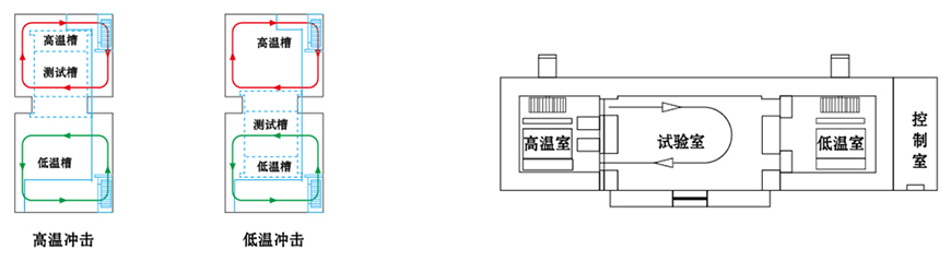 | 兩廂設(shè)備區(qū)分為高溫區(qū)和低溫區(qū)兩部分,測(cè)試產(chǎn)品置于提籃中,沖擊時(shí)提籃將測(cè)試產(chǎn)品 | ||